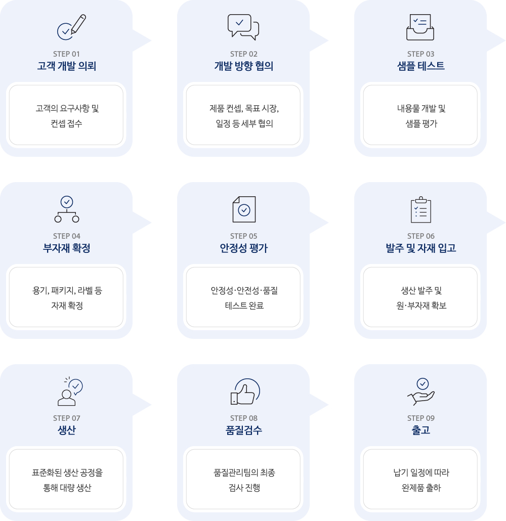 ODM(Original Development Manufacturing)은 고객의 아이디어를 바탕으로 제품을 직접 기획·개발·생산하는 일괄 개발 시스템입니다.